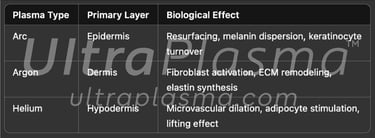 Arc Plasma (4.5–5.5 eV): Provides thermal ablation and superficial epidermal resurfacing.