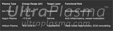 • Arc plasma (4.5–5.5 eV) delivers focused superficial energy, ideal for epidermal interaction.