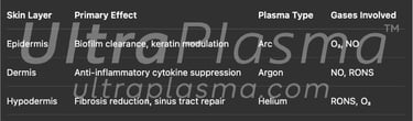 The UltraPlasma™ approach is fundamentally distinct in its ability to selectively target skin layers—epidermis, dermis, and hypodermis—through different plasma types (arc, argon, and helium) while delivering biochemically active gases such as ozone (O₃), nitric oxide (NO), and reactive oxygen/nitrogen species (RONS). This cross-sectional and gas-mediated specificity allows UltraPlasma™ not only to eliminate surface pathogens and biofilms but also to modulate inflammation, restore vascular function, and remodel subdermal fibrotic tissues that are hallmarks of advanced HS.