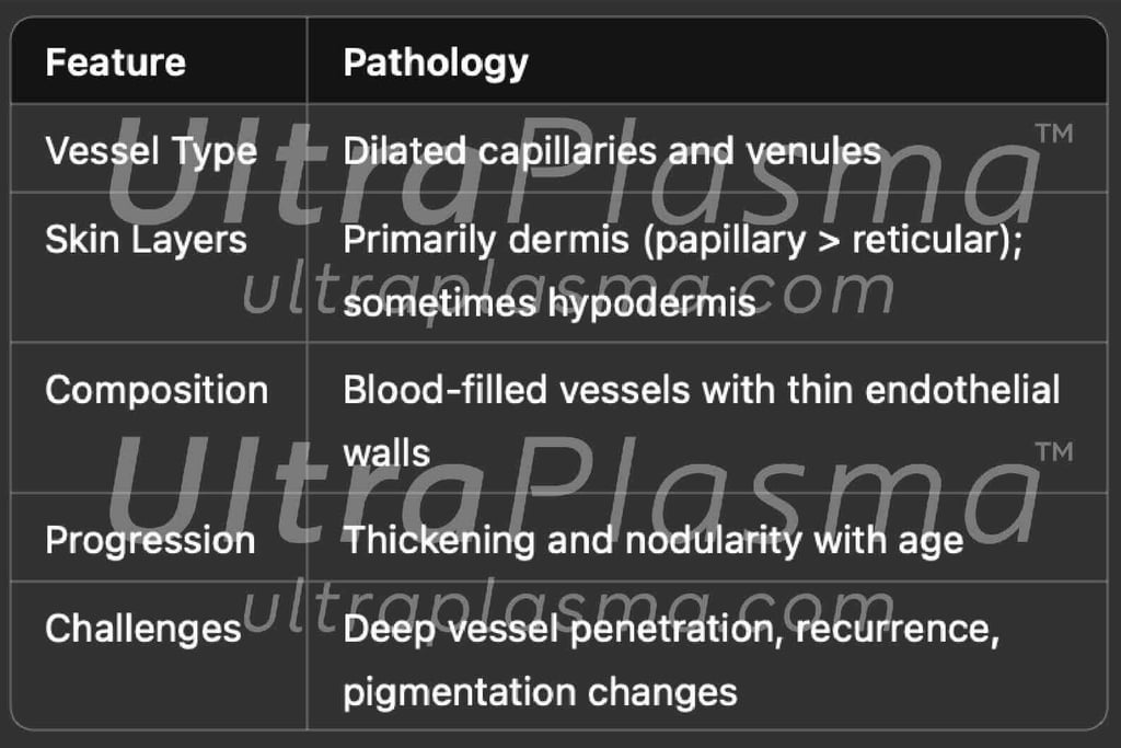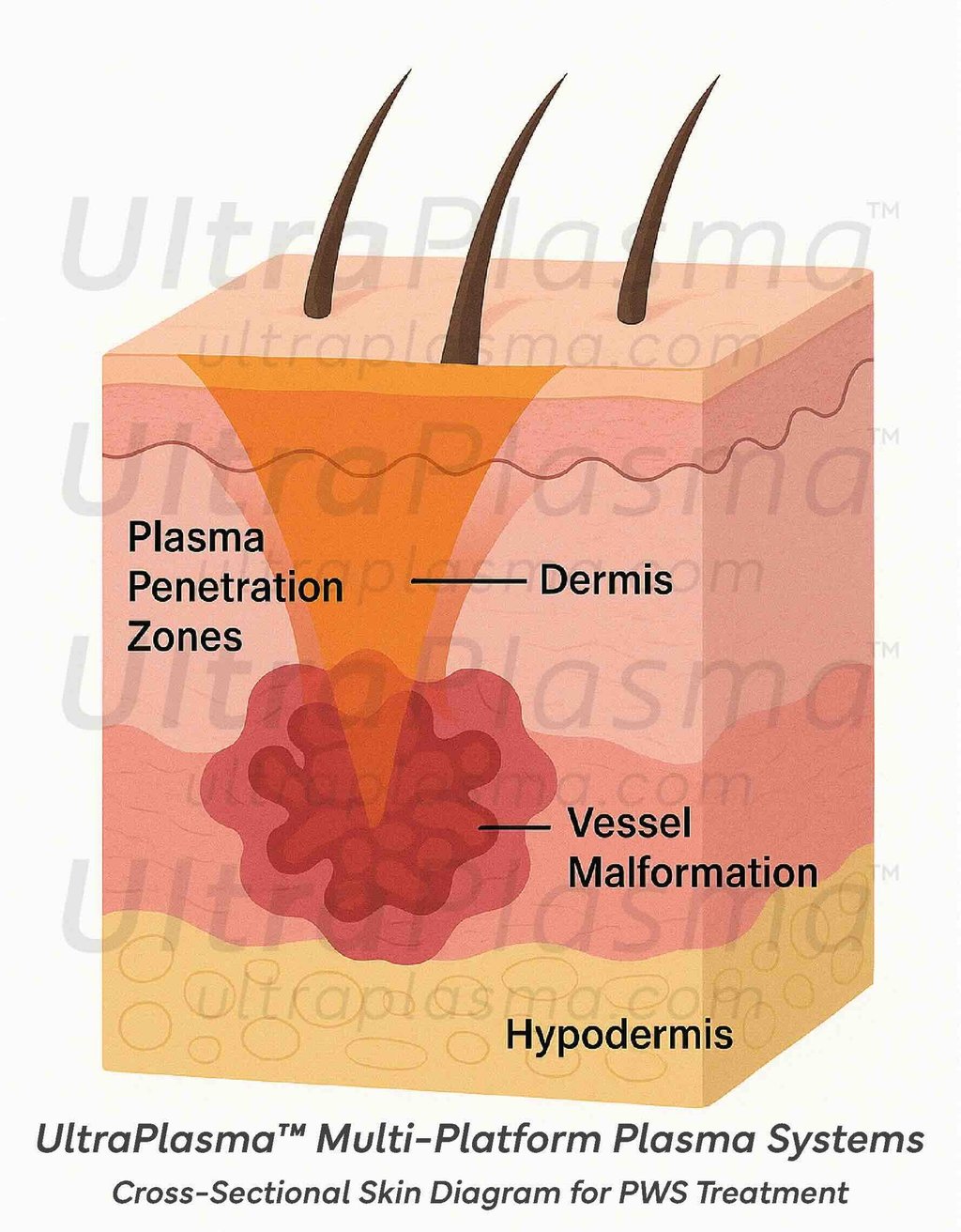 Port-Wine Stain (PWS), or nevus flammeus, is a congenital capillary malformation characterized by ectatic dermal blood vessels. Traditional laser treatments often result in incomplete clearance and high recurrence rates. The UltraPlasma™ multi-platform system, combining arc plasma, argon plasma, and helium plasma technologies, offers a novel, non-thermal, minimally invasive approach for PWS treatment. Through controlled plasma-mediated photochemical and photothermal interactions targeting the epidermis, dermis, and hypodermis, UltraPlasma™ facilitates vascular coagulation, vessel remodeling, fibroblast activation, and immune modulation via reactive gas species like ozone (O₃) and nitric oxide (NO). This article explores the mechanisms of UltraPlasma™ in PWS treatment, cross-sectional skin interactions, gas effects, and clinical outcomes, supported by detailed figures.