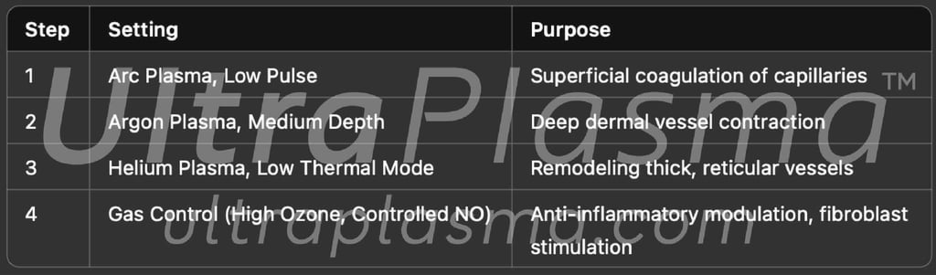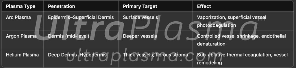 Each plasma type can be adjusted in output parameters (voltage, frequency, pulse width) and gas ratios, enabling selective targeting of superficial and deep dermal blood vessels.
